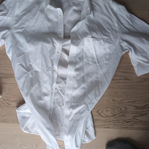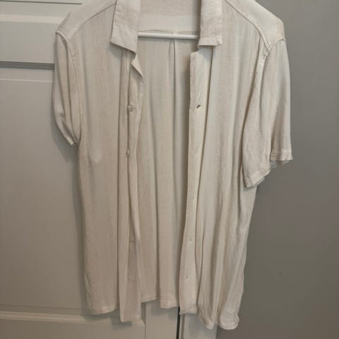 H&M Regular Fit skjorte i fargen hvit, størrelse XL. Skjorten har kort erme og er laget i et lett stoff. Den har en brystlomme og knapper foran.