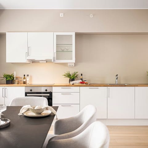Integrert stekeovn fra Siemens. Platetopp med induksjon fra Siemens. Kjøleskap/frys fra AEG Elektrolux. Ventilator. Blandebatteri fra Oras Armatur.