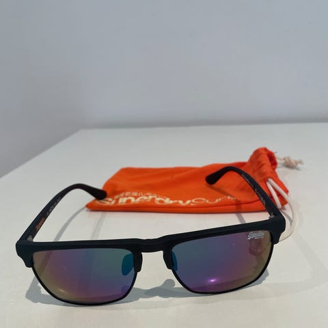 Pilot aktige briller. Noe mere firkantet. Og farget solbriller, med en logo manglende på siden. De er på sett og vis gratis til dette. Med brillebag.