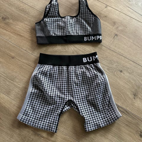 BumPro treningssett for kvinner i størrelse M, bestående av sports-BH og tights. Sett i grått materiale, egnet for fitnessaktiviteter.