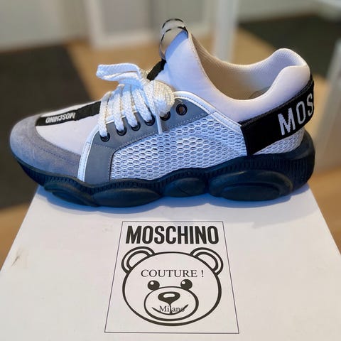 Moschino sneakers joggesko i størrelse 42. Skoene har en svart overdel med hvit Moschino-logo og hvit såle. Designet for komfort og hverdagsbruk.