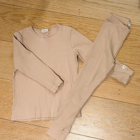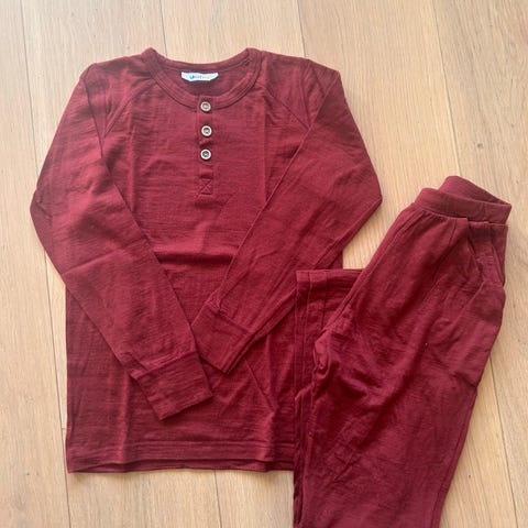 JOHA ullsett str. 130 (128/134) til salgs. 100% Merinoull. Okergul farge. Settet har noen svake skjolder/flekker.