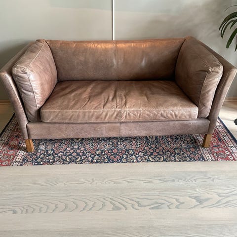 Klassisk lys beige sofagruppe 3+2 behagelig, relativt ny, moderne og pent brukt. Treben som vist