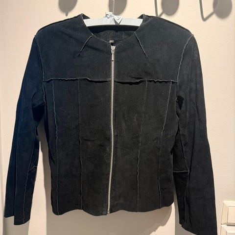 Stilig kort skinnjakke i ekte geiteskinn (Olivia Bolero, str. 38). Farge: sort. Jakken har kule detaljer med glidelåser og perforert mønster på siden. Tidløs, men samtidig edgy – passer både til kjole og jeans.
