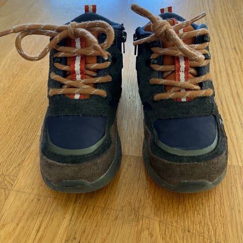 Brukte høstsko fra ZARA i størrelse 27. Skoene har hurtigtørkende overflate og hurtigsnøring, noe som gjør dem enkle å ta på selv for mindre barn. Innerstoffet er mykt og komfortabelt, så de egner seg godt til barnehage eller fritidsbruk. Sålene har godt grep og sitter fint på foten.