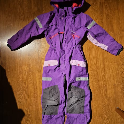 Didriksons viterdress i størrelse 120, farge lilla, designet for jenter. Dressen har refleksdetaljer for økt synlighet og er laget i slitesterkt materiale. Den har glidelås og knapper foran, lommer på siden og forsterkede områder på knærne. Egnet for utendørs bruk i kaldere vær.