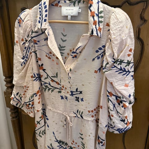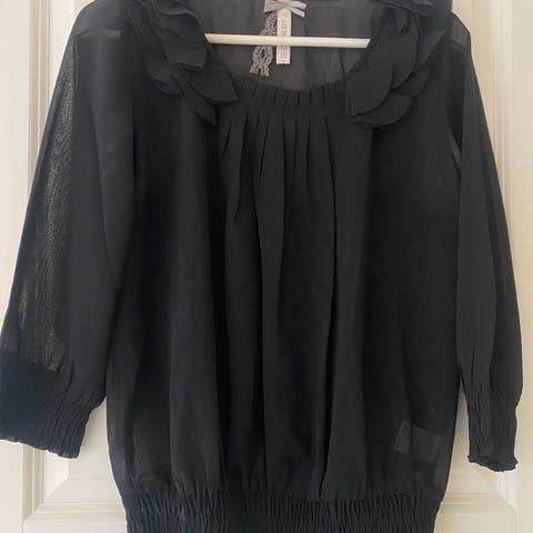 Nydelig langermet topp av merket Munthe . Nydelige legg i front. Nederst på ermene og nederst på toppen svarte dusker med tau. . Størrelse 40. Mål fra underarm til underarm er strukket ut 58 cm. Fra nakke og ned 59cm. Ermene fra underarm og ned er 35 cm. Med 100 % viskose? Klippet vekk lappen. Veldig fin