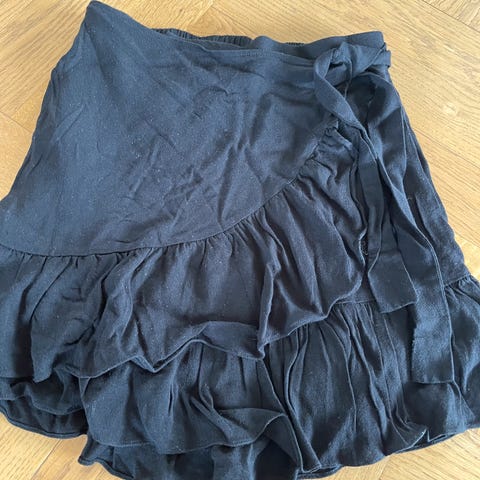 Svart skjørt med påsydde paljetter i front. Assymetrisk lengde, se detaljbilder for mål.