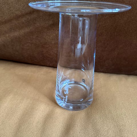 Hadeland Glassverk vase/lysestake laget i klart glass i designet Finn Schjøll. Produktet har en rund base og en bred topp, med tydelig Hadeland Glassverk merke på bunnen.