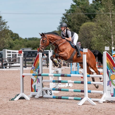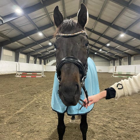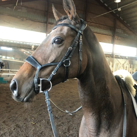 Omskolert fullblods på 5 år selges som hobbyhest, lett dressur og tur. Kan muligens brukes til veldig lett sprang.