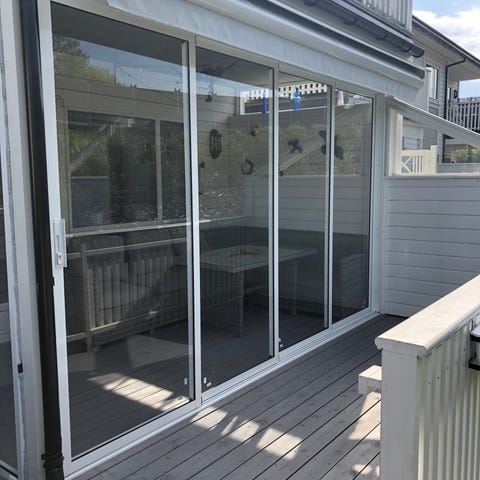 Innglassing: Skyvedører i aluminium med 5 mm enkelt herdet glass eller 2-lags glass for bedre isolering.
