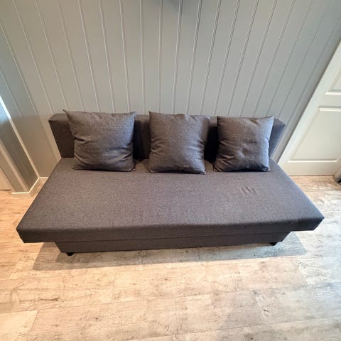 Gråblå sovesofa med 2 puter. Lite brukt og har ingen bruksmerker
