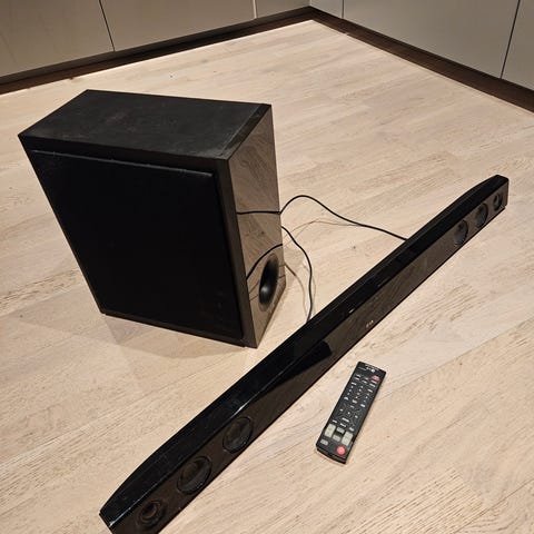 Selger en LG SJ9 Wireless Multi-Room Soundbar med tilhørende LG SPJ9B-W trådløs aktiv subwoofer.