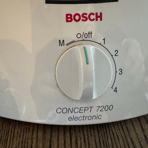 Bosch Compact 200 kjøkkenmaskin i hvit farge med rustfritt stål bolle og akryl-bolle. To spesiallakk til bollene. To sett visper og to stk eltekroker. Maskinen har justerbar hastighet med flere nivåer for ulike kjøkkenoppgaver. Bruksmerker. Et hakk i godset der bollen settes på. Fungerer fint. Selges rimelig.