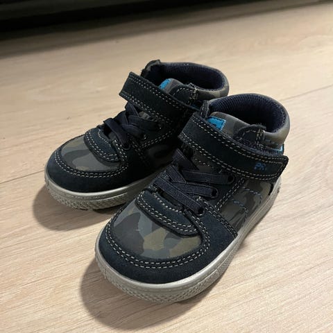 Superfit barnesko for unisex i størrelse 21. Skoene har beige og blå farger, med snøring og glidelås for enkel påkledning. Materialet er slitesterkt og egnet for små barns føtter.