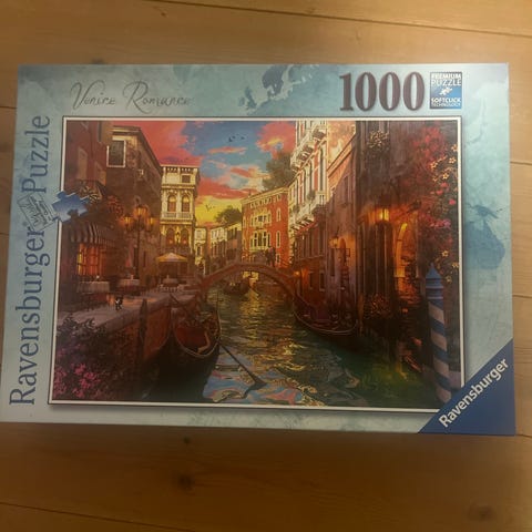 Flott puslespill fra Ravensburger. Motivet viser en gondol på en kanal i Venezia, Italia.