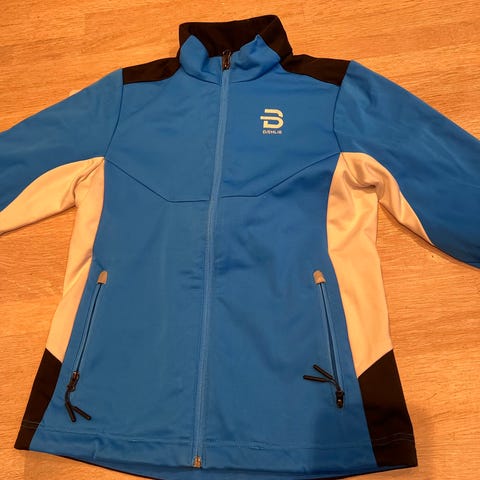 Dæhlie Junior ullgenser i størrelse 140, med rosa front og grå ermer og rygg. Genseren har en glidelås i front og er laget av en blanding av ull og polyester. Materialet gir varme og komfort, egnet for barn. Designet inkluderer ribbestrikkede ermer og skulderdetaljer i lysere farge. Det er en liten flekk på magen, og litt nede ved armen.