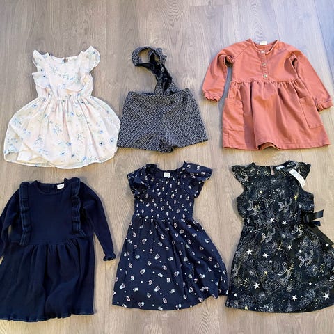 Barneklær for jente i størrelse 98 . Inkluderer en heldrakt i rosa med glidelås foran og to kjoler.