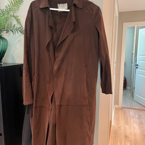 UTERQUE semsket jakke i 100% goat leather. Jakken er uforet og har stikklommer i sidene. Lukkes med skjulte hemper. Ermene kan rulles opp som vist på bilde...eller man kan ha de i full lengde. Den er i str. S, og er normal I størrelsen. Kjøpt for noen år siden i Barcelona, og kostet ca 3000.- ny. Har hengt ubrukt i mitt skap.