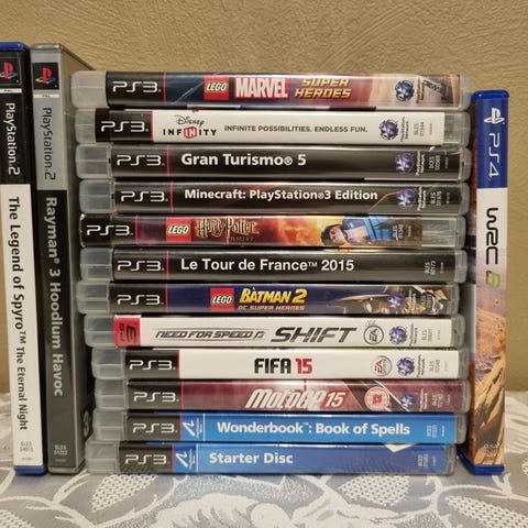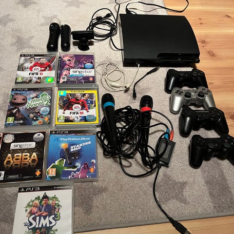 Playstation 3 med ulike kontroller, gitar og 20 spill