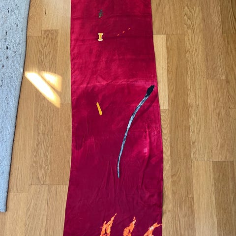 Vakre rødfarger og sort på silketrykk str. 72 cm bredt og 52 cm høyt, meget vakkert...og innrammet...