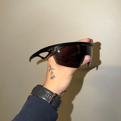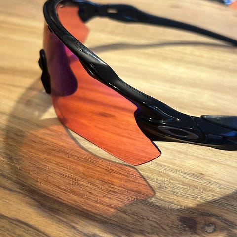 Selger et par pent brukte Oakley-briller. De to siste bildene viser det jeg kan se av skader på dem. Utover normal bruksslitasje er de i veldig god stand. De har alltid blitt oppbevart i mikrofiber-posen og hardcasen, som medfølger.