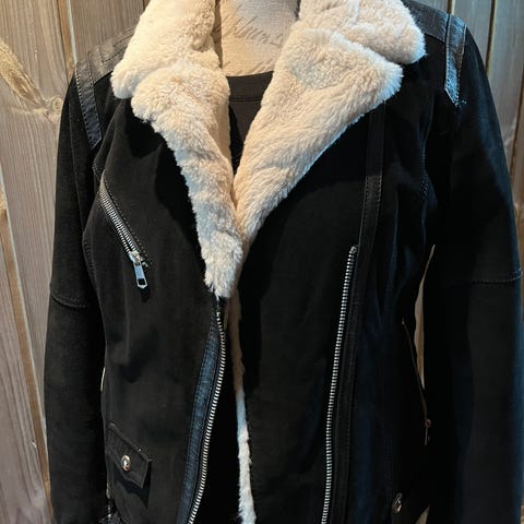 Finn-Fair semsket vinterjakke i størrelse 36 til dame. Jakken er brun og laget av semsket skinn med ullfor. Modellen har knappelukking og er designet for vinterbruk, med et varmt og slitesterkt materiale. Produsert av Satamanka Oy i Finland.