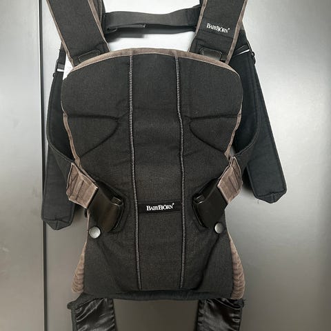 Eldre babybjörn-bæresele til herre, for bæring bakovervendt, altså mage mot mage.