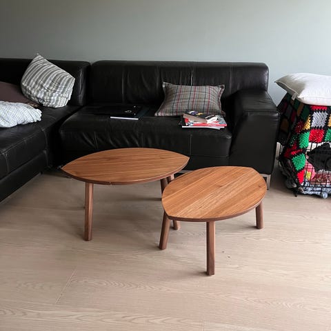 Kvistbro-stort salongbord fra Ikea. Oppbevaring av pledd i kurven under.