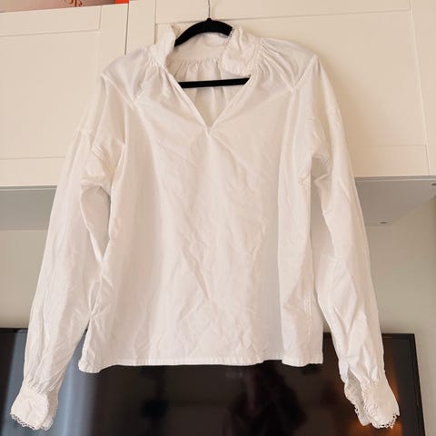 Pent brukt bunadsskjorte hvit med nupereller, blitt brukt til øst- telemark bunad😊 ferdig sydd hull til søljer. Tilsvarer størrelse small, se bilder for mål.
