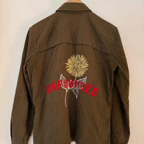 Zara skjortejakke i beige farge, størrelse S for menn. Jakken har knappelukking foran og to brystlommer. Laget i materiale som gir en lett og komfortabel passform. Selger grunnet den er for liten.