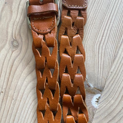 Flettet belte i svart skinn med spenne i metall. Passer til både menn og kvinner.Kan sendes om kjøper betaler frakten.