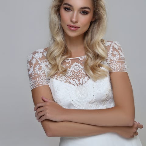 Elegant V hals brudekjole med korte ermer fra SADONI bridal str 36 - helt ny! Koster 19 800 helt ny og den selges nå for 9 800,- Kjolen har en delikat V utringning, og et smalt A linje skjørt i en vakker romantisk laser kuttet blonde.