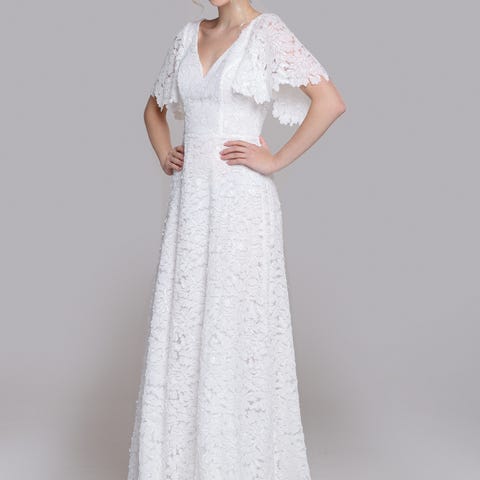 Elegant og uformell V hals brudekjole fra SADONI bridal str 36 - helt ny! Koster 19 800 helt ny og den selges nå for 7 800,- Kjolen har en delikat V utringning, og et smalt A linje skjørt i en moderne blonde.