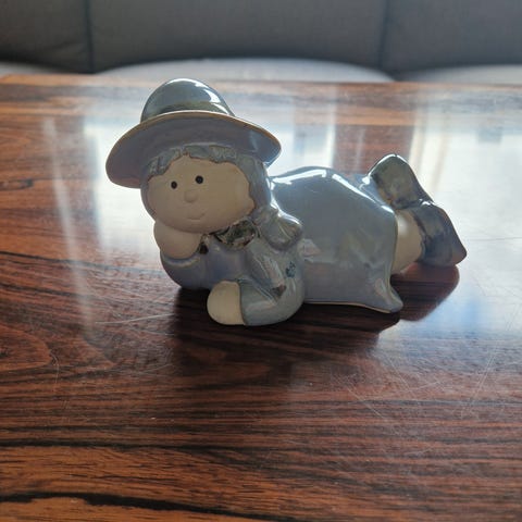 Keramisk figur av en dame iført grønn skjørt, rosa overdel og hvit forkle, holder en liten katt. Håndmalt med detaljer som inkluderer en liten skål i hånden og en katt ved føttene. Egnet som dekorasjon.