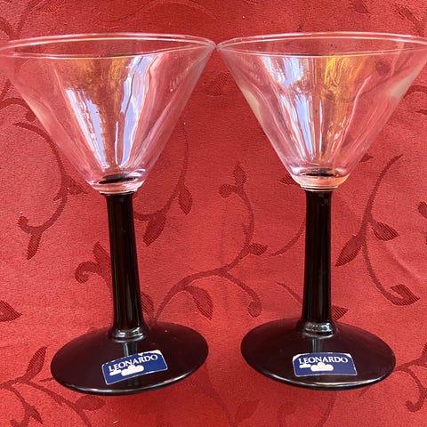 Ukjent merke og modell glassflasker med druemotiv, inkludert to glassflasker og tre drikkeglass. Flaskene og glassene er laget av klart glass, og de er plassert på et stativ av tre. Produktet kan brukes til servering og oppbevaring av drikkevarer.