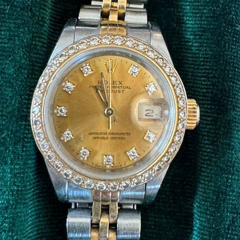 Rolex Datejust dameklokke med to-tonet armbånd i stål og gull. 69173. Klokken har en rund urskive med datovisning, og er designet for damebruk. Inkluderer original sertifisering og dokumentasjon.