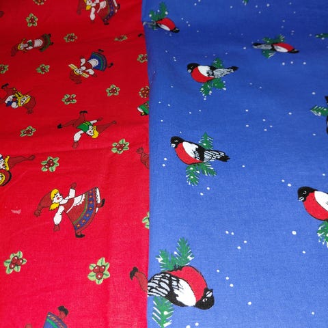 Ubrukt bomulls tekstil i dyp, klar rødfarge. Sjarmerende julemotiv