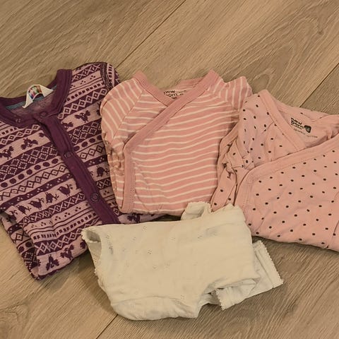 Størrelsene er stort sett 62 og 68, men et par av dem er 74 og 80 også.