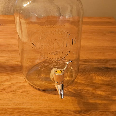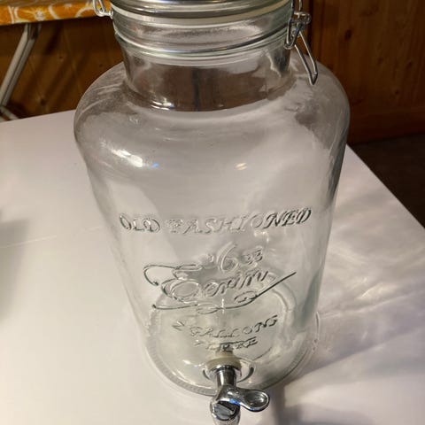 Plasser glassdispenseren på en benk eller et bord med tappekranen utenfor kanten. Skrulokket sørger for å holde veps og andre småkryp unna innholdet.