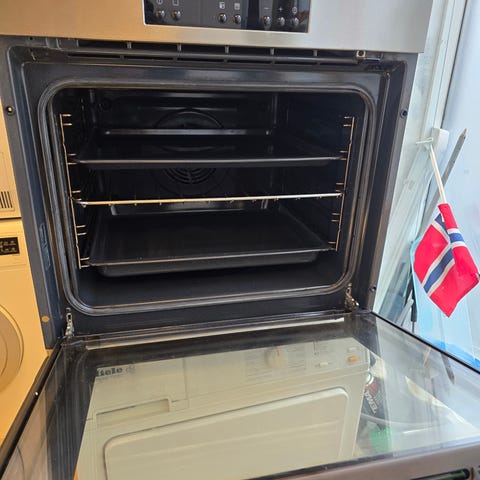 Mangler en skrue på bakveggen, høres når varmluftsviften går. Kan fint skrus inn en ny skrue.