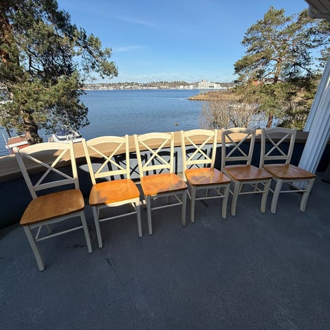 Selger 2 kjøkkenstoler som bare har stått på lagring i flere år. 100 kr pr stk.Det er gode stødige stoler.
