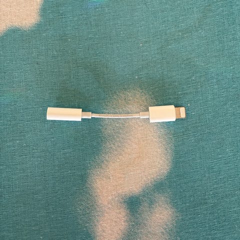 Apple Lightning til 3,5 mm hodetelefonadapter som gir mulighet for tilkobling av hodetelefoner med 3,5 mm plugg til enheter med Lightning-port. Adapteren er hvit og har en kort kabel mellom Lightning-kontakten og 3,5 mm kontakten.