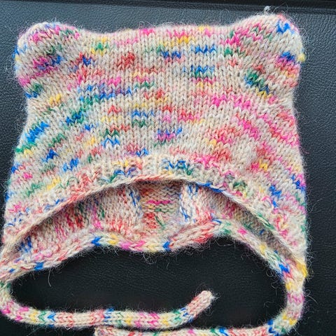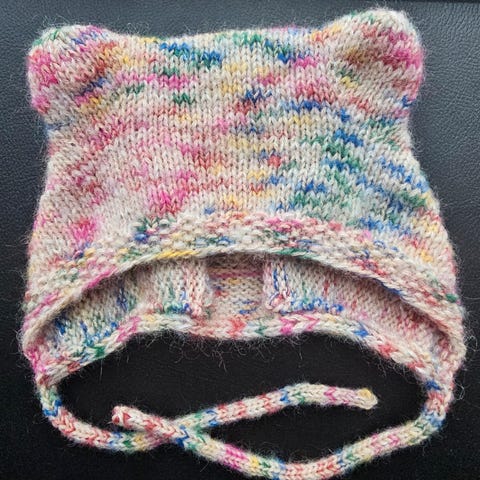 Lillebjørnlue fra Knitting for Olive. Ubrukt. Strikket i babygarn og en tråd merino (ikke rundt ansiktet). Minste str.