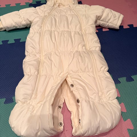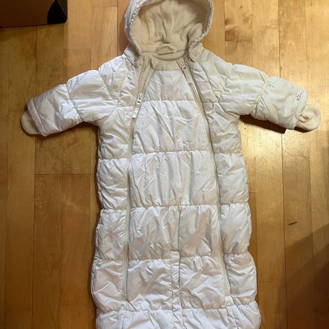 En vattert overall i quiltet, vevd kvalitet med hette, to skjulte glidelåser foran og lange ermer med brettbare votter nederst for å forhindre kloring. Fleecefôret.