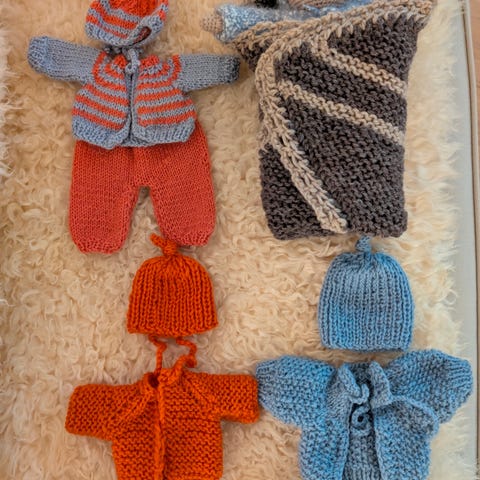 En pakke hjemmestrikket dukkeklær