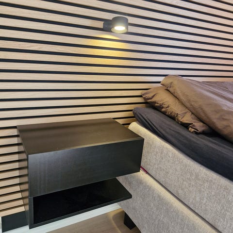 Selvlagde vegghengte nattbord.