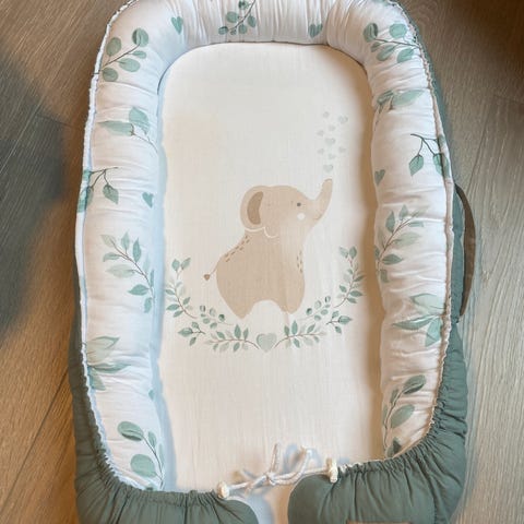 Pent brukt babynest fra Albero Mio i gul farge med koala-motiv.