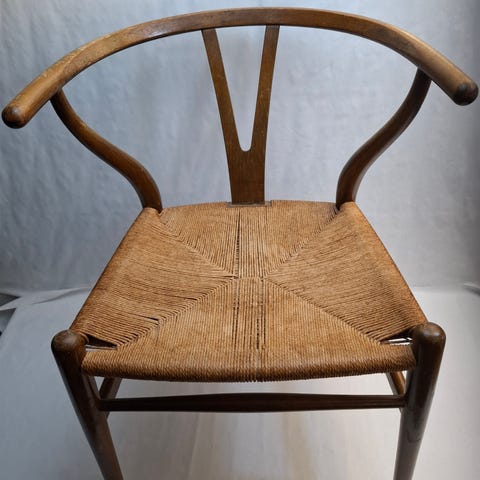 Hans J Wegner Y-stol spisestol med svart ramme og flettet sete. Designet av Hans J Wegner, kjent for sin klassiske og funksjonelle stil. Stolen har en karakteristisk Y-formet ryggstøtte og er laget av tre med flettet materiale på setet. Egnet for bruk i spisestue eller som ekstra sitteplass. Stolen koster 6960kr på LÄNNA møbler for øyeblikket. Den er kjøpt i 2022. Stolen er autentisk.