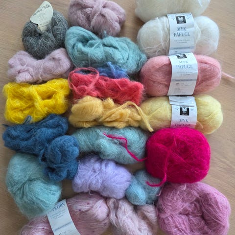 Div Restegarn selges. Det er 11 forskjellige pakker med forskjellig garn, noen nøster er åpnet, dvs brukt av, og noen nøster er hele.